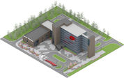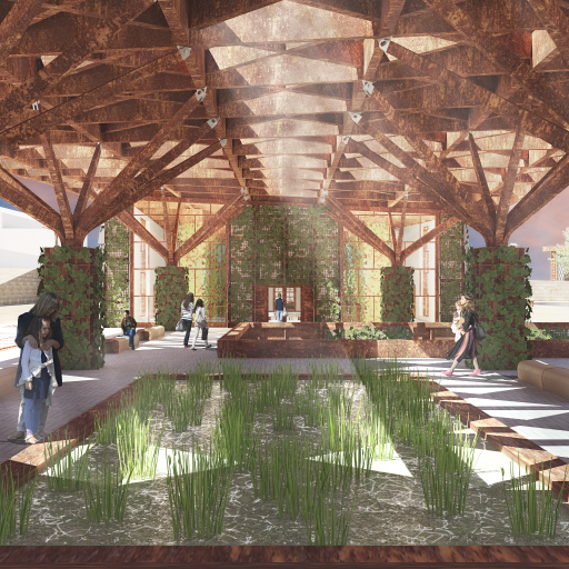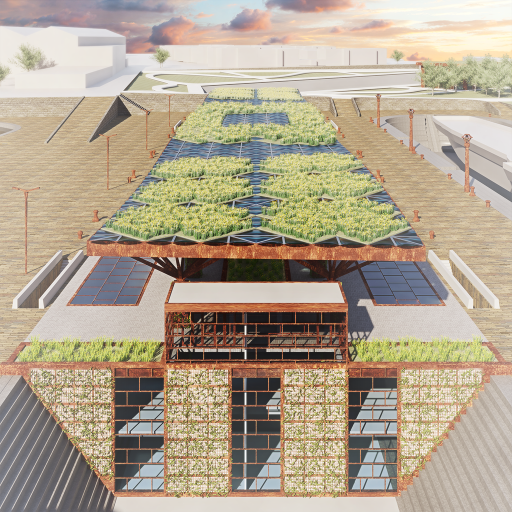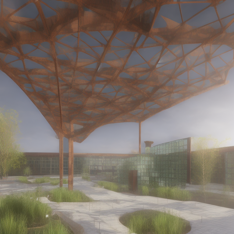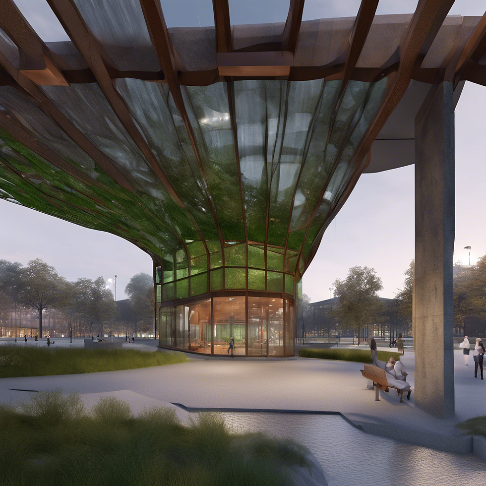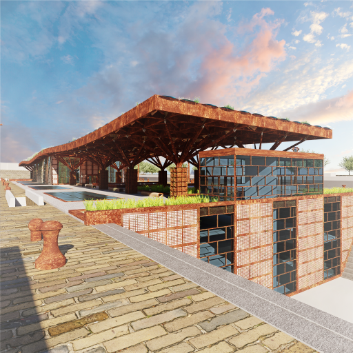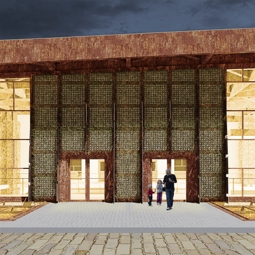 3/4 eye-level exterior render of a graving dockmaritime museum in an urban park in the dusk. Pavilion with green façade, curtain walls, corten steel canopy and branching green columns, grey and sandstone paving, walkable skylights, benches, stairs, grey granitegraving docks, rustybollards and trees. Industrial and green atmosphere, artificial lighting, cloudy sky, 2-point perspective, VRay.