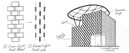 The proposal for a private house in Rovinj. As the client was unsure about the stylistic solution for his housing, the strategy was that each practice employee propose the design solution for review. Located on a hill slope in Croatia, the site is characterised by high solar gain and marine climate. My project proposed the introduction of the dynamic façade. Timber panels, installed on the shafts would rotate depending on the house’s exposure to the sun and time of the day. This would allow adjusting the indoor temperature with reduced energy consumption by artificial ventilation, as excess heat from solar radiation would be removed on sunny days, while additional light would be provided on overcast ones. The top floor terrace would be protected by parametric timber & fabric canopy.