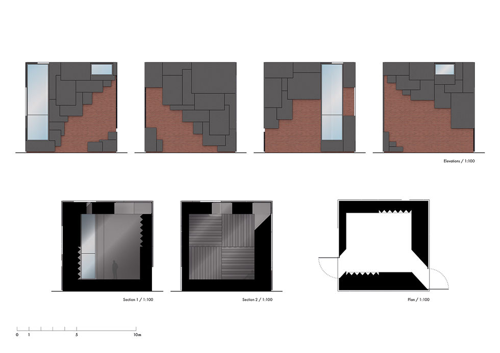 The project upgrade proposes manufacturing the hideout using masonry and metal panels. The irregular pattern of the facade finish is used to demonstrate the qualities of the brickwork and create a dynamic composition that works with openings. Mobility and easy structure make it perfect for prefabricating and placing in any environment. The materiality solution can be done in any colour scheme to achieve maximum correspondence with the context.