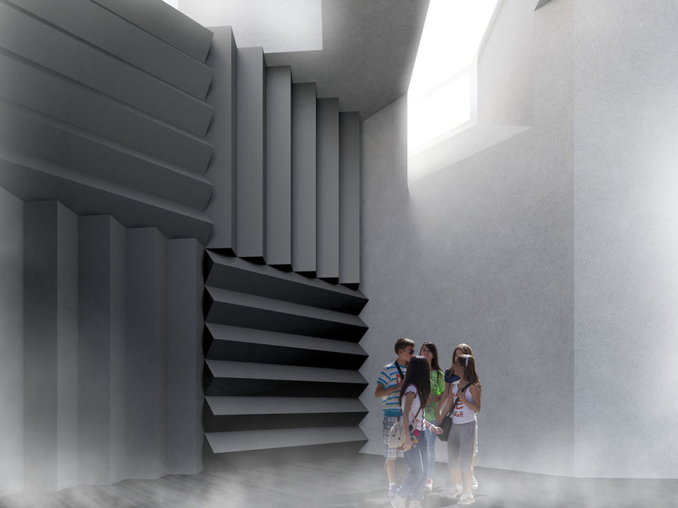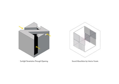 The early project developed in the first year of architecture had to introduce the students to the qualities of physical matter as an abstract form and as a device of spatial organization. Using a 7.5x7.5x7.5m cube as the base shape, a hideout with interior space and openings was proposed. The exterior features continuous openings that explore qualities of penetrating sunlight, while the interior features faceted walls that explore sound-absorbing qualities.