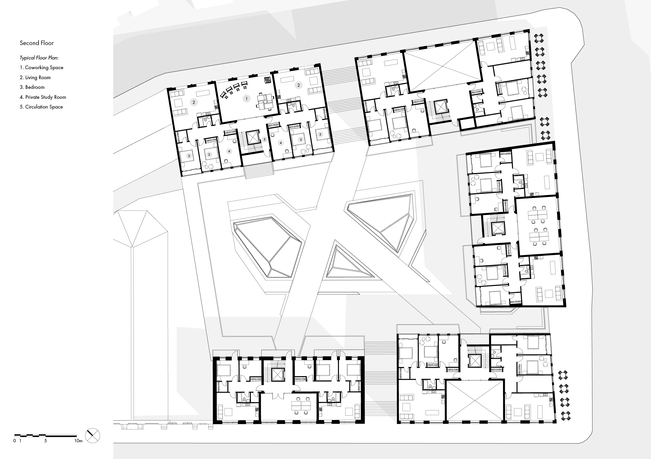 However, despite all the negative aspects listed above, plenty of employees showed interest in the provision of more opportunities for working at home, while remote studying for all age groups becomes more common. The aim of my proposal is to face these major challenges by creating an autonomous bubble accommodation unit, where young economically active people and their children would be able to combine living with working, studying and recreation. The proposal reiterates Victorian Glasgow tenement housing composition for a more successful response to contemporary lifestyle and demands. Using the 15-minute city theory in studying of Calton & Bridgeton neighbourhood and scaling it down to one housing block, my proposal apart from flats with necessary working space accommodates specialized coworking areas for residents with provided equipment, commercial spaces on the ground floor and childcare, public learning, sports and outdoor amenities in the top floor.