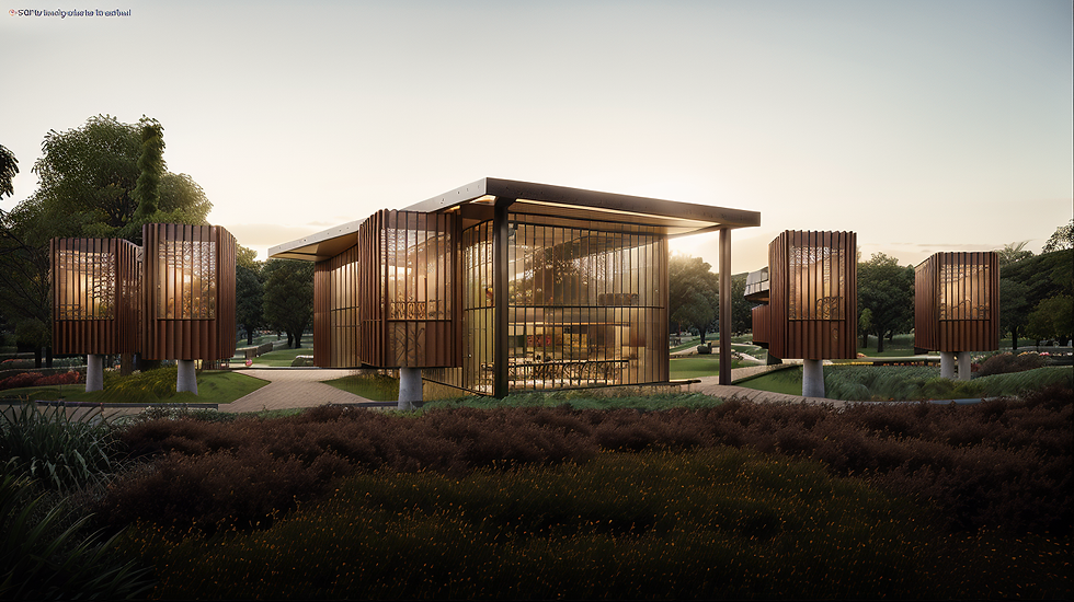 Generate a Stable Diffusion scene featuring a picturesque 2-story cafe building nestled within an urban park. Visualize the cafe building with a rectangular plan, captivating with its corten steel facade seamlessly integrated with lush vegetation. Adorn the facade with tall, elegant windows that allow natural light to pour in. Imagine a stunning parametric corten steel canopy gracefully supported by branching corten steel columns, covered in enchanting climbing vegetation. Situate this cafe building within the former shipbuilding site, where constructed wetlands and majestic trees surround it. Set the time of day to dusk, casting a tranquil ambiance over the scene. Craft an atmosphere that harmoniously blends industrial and green elements, capturing the essence of the park's unique location. Lastly, render this captivating image with VRay to enhance its realism and appeal, making it a truly memorable depiction of this urban park cafe.