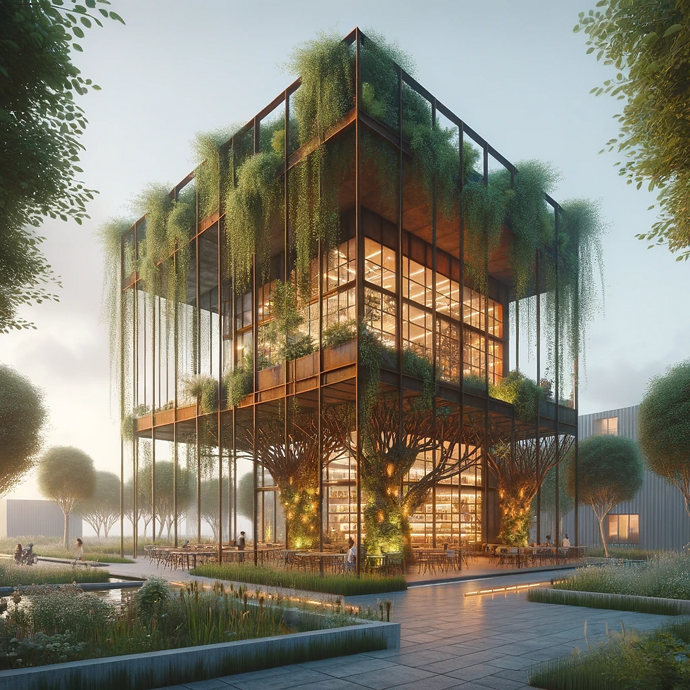 "Generate an image of a 2-story cafe nestled in an urban park. The cafe's design features a rectangular layout and a striking corten steel facade adorned with integrated vegetation, showcasing tall windows that let in the warm dusk light. A parametric corten steel canopy gracefully stretches above the structure, supported by branching corten steel columns, which are lushly covered with climbing vegetation. This unique cafe is situated within a former shipbuilding site, with the surrounding landscape boasting constructed wetlands and a dense canopy of trees. The setting is bathed in the soft glow of dusk, creating a captivating atmosphere that seamlessly combines industrial elements with vibrant greenery. The image should be rendered using VRay."