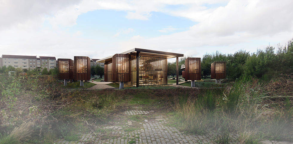"Generate a Stable Diffusion scene featuring a picturesque 2-story cafe building nestled within an urban park. Visualize the cafe building with a rectangular plan, captivating with its corten steel facade seamlessly integrated with lush vegetation. Adorn the facade with tall, elegant windows that allow natural light to pour in. Imagine a stunning parametric corten steel canopy gracefully supported by branching corten steel columns, covered in enchanting climbing vegetation. Situate this cafe building within the former shipbuilding site, where constructed wetlands and majestic trees surround it. Set the time of day to dusk, casting a tranquil ambiance over the scene. Craft an atmosphere that harmoniously blends industrial and green elements, capturing the essence of the park's unique location. Lastly, render this captivating image with VRay to enhance its realism and appeal, making it a truly memorable depiction of this urban park cafe."